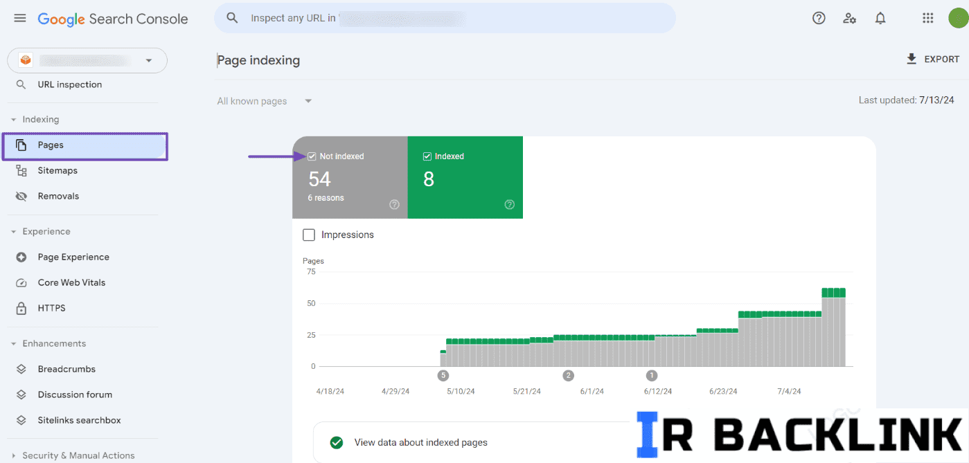 • رفتن به بخش صفحات در GSC: ابتدا به بخش Pages در کنسول جستجوی گوگل بروید و خطای مشخصی را که آن را رفع کرده‌اید (مانند “یافت نشد (404)”) پیدا کنید. بر روی دسته‌بندی خطا کلیک کنید.